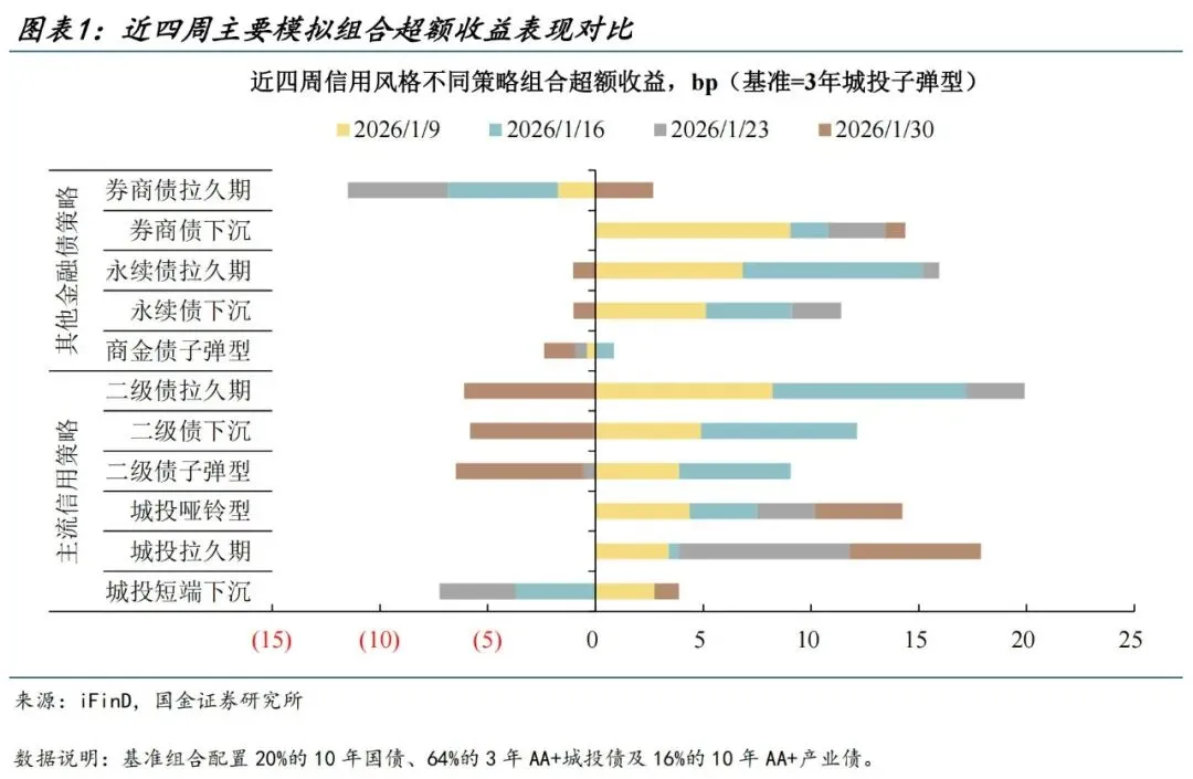 截至1月30日,城投重仓策略累计收益开始反超二永债组合。具体来看,年初以来多数策略累计收益超过基准,城投债久期、永续债久期及券商债下沉组合的累计超额分别达到17.9bp、14.9bp、14.4bp。银行次级债重仓组合累计超额收益与城投债组合基本持平,但二级资本债重仓策略收益相比于基准波动较大,上周二级债子弹型策略超额损失更是几乎侵蚀此前三周70%的超额收益。