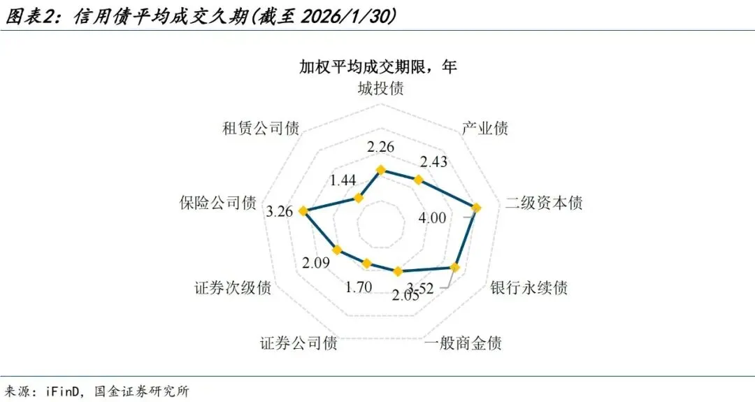 普信债成交久期仍在高位。截至1月30日,城投债、产业债成交期限分别加权于2.26年、2.43年,商业银行债中,二级资本债、银行永续债以及一般商金债加权平均成交期限分别为4.00年、3.52年、2.05年,其中二级资本债处于较高历史水平;从其余金融债来看,证券公司债、证券次级债、保险公司债、租赁公司债久期分别为1.70年、2.09年、3.26年、1.44年,其余金融债久期整体较上周有所缩短,租赁公司债久期历史分位数处于较高历史分位。