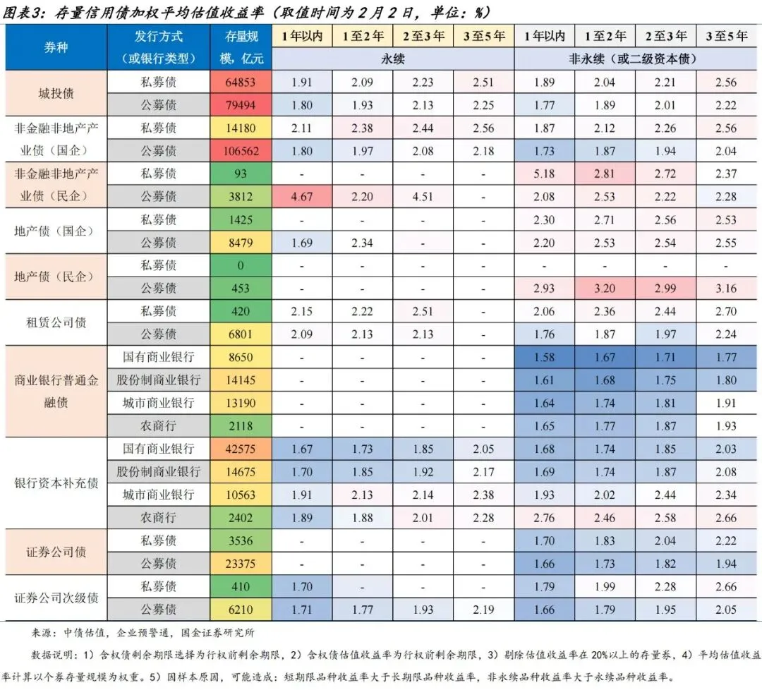 截至2026年2月2日,存量信用债中,民企产业债和地产债估值收益率及利差整体高于其他品种。与上周相比,非金融非地产类产业债收益率多小幅下行,价格波动幅度基本在3BP内,其中2-5年品种总体表现更优;一般商金债中3-5年品种收益率出现下行,3年内品种收益率上行幅度低于3BP;二永债中各品种收益率同样多上行,不过永续债价格相对稳定,2-3年二级资本债调整幅度更大,其中国有行品种上行4BP;此外,证券公司债及次级债中,1年内、2-3年品种收益率多数上行。