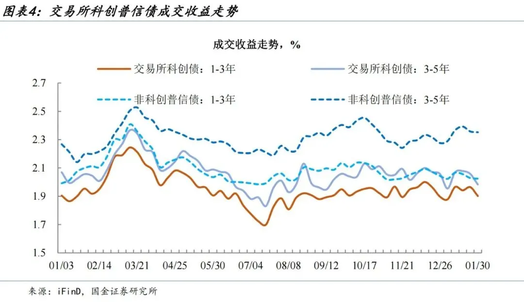 收益率视角上,因科创债ETF资金净流出压力边际趋缓,叠加债市情绪回暖,科创债行情得到支撑。本周(2026.1.26-2026.1.30)高等级中短期限科创债表现亮眼,其中1-3年、3-5年交易所AAA科创债收益率均值分别下行6.3bp、7.5bp。
