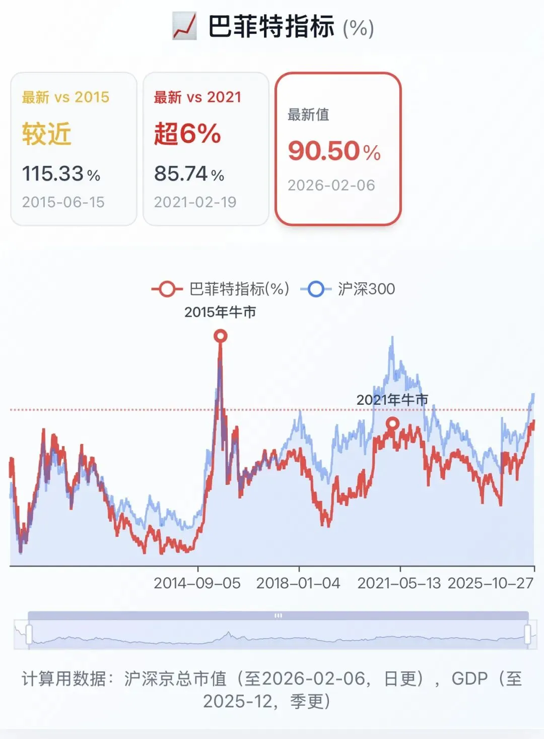 巴菲特指标90.50/极值(146.53、115.33、85.74)