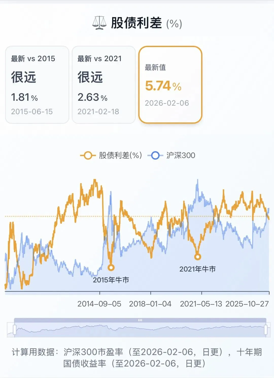 股债利差5.74 /(极值-2.22、1.81、2.63)
