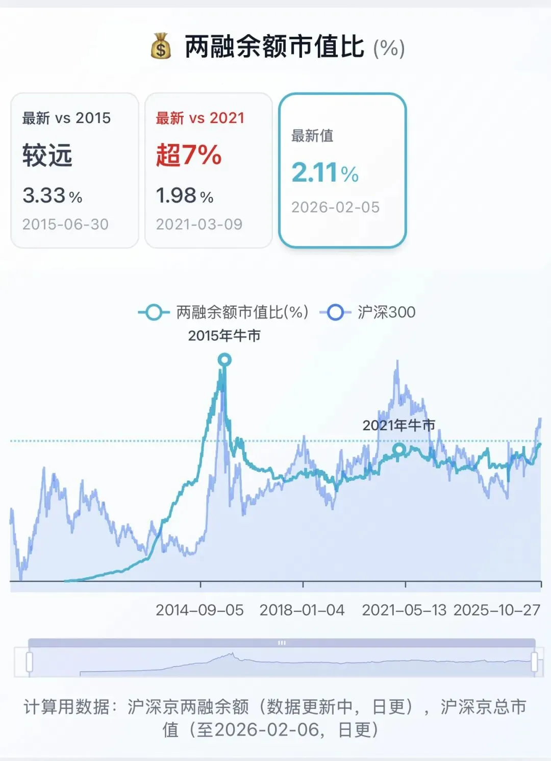 两融余额总市值比 2.11%(参考极值 3.33%,距离较远;)