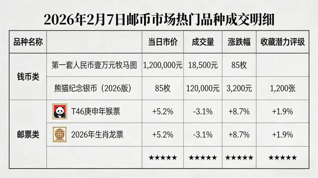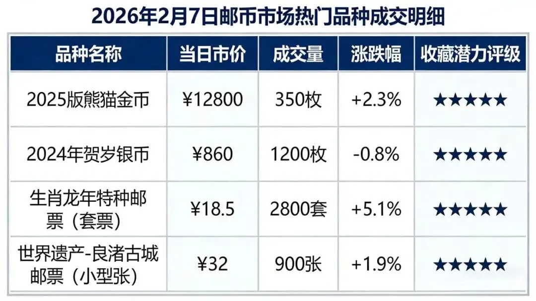 2026年2月7日,临近农历春节,钱币市场整体进入节日前的盘整阶段。市场交投以刚需和精品布局为主,呈现出“生肖品种小幅回调,龙头藏品价格坚挺,号码溢价效应显著”的典型节前特征。