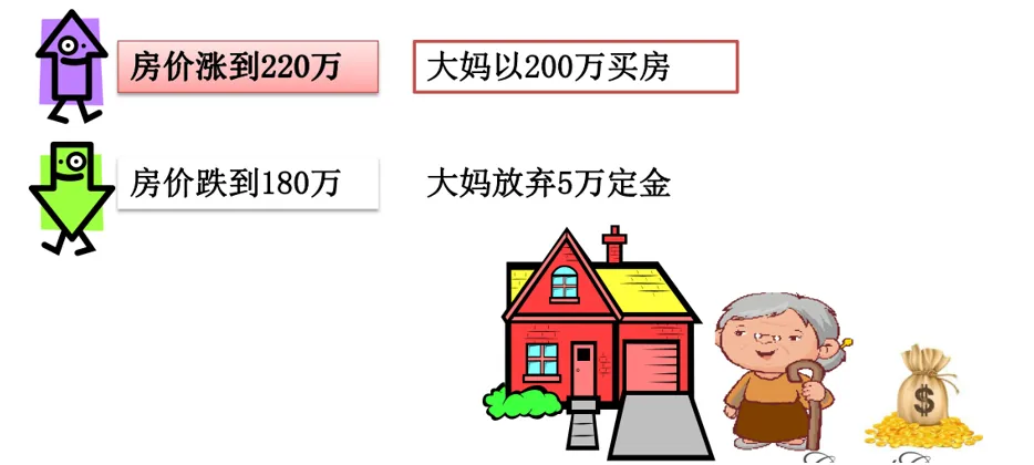 大家试想一下,如果这栋房子的价格在一年后涨到350万,楼花的买方就会行使权利,依然按300万来购买这栋房子,对买方来说是划算的。如果这个房子的价格一年后跌到200万,楼花的买方就不会行权了,因为几乎没有人会愿意以300万的价格买入市价只有200万的房子。但需要注意的是即使楼花买方不买这栋房子,这10万的定金也是不会退回的。这就是认购期权在现实中的例子,花一笔权利金(本例中是10万)锁定了未来的买入价(本例中是300万)