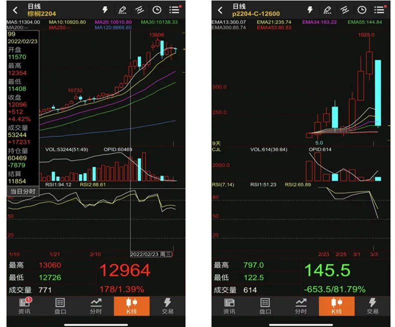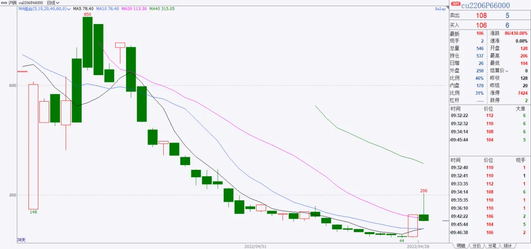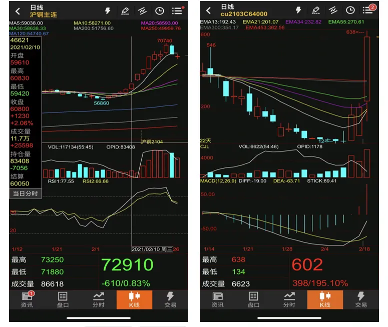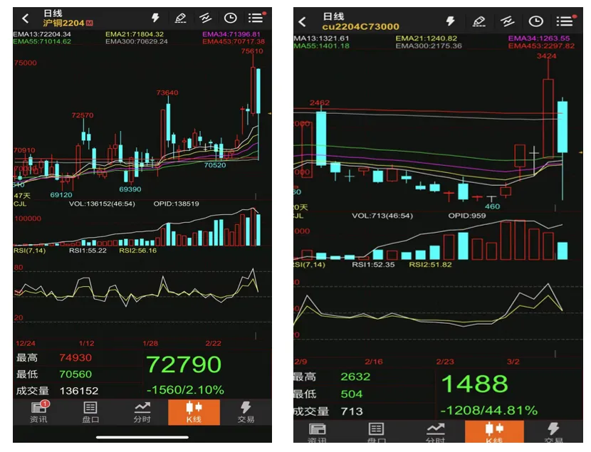 从左边二图对比可以看出,沪铜从70520-75610的大涨中,涨幅为7.2%,而铜期权73000看涨合约实现了460-3424,累计涨幅7440%
