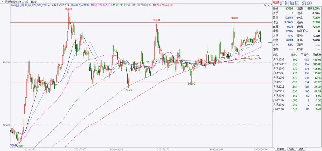 如2022年3月8日的铜行情,如果是购买了沪铜期货,把止损线设置在前高附近,则已经触发了止损,不设置止损需要承担更大的心理压力。