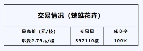 7日,姚安花拍中心全渠道交易总量约为490210枝,今日供货量较前一交易减少,总体购买力持平。成交率小幅下跌,交易情况如下: