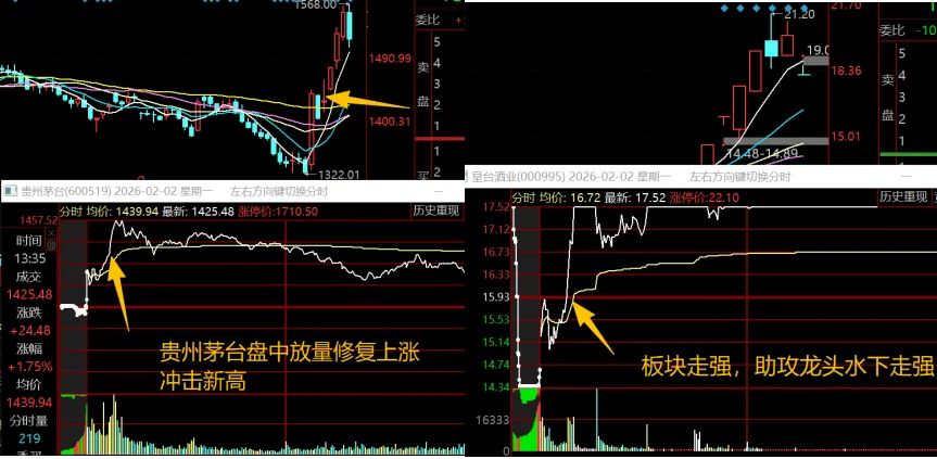 上周四白酒板块多股涨停,驱动力就是茅台单日大涨,周一茅台修复反包冲击新高,是可以带动皇台酒业走强的!这种属于板块走强或者说核心权重走强,助攻龙头连板。