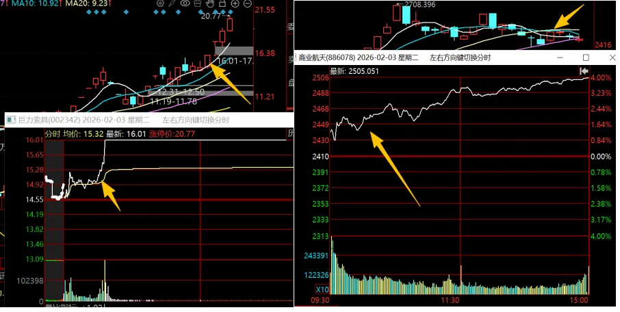 至于商业航天,这个时候龙定位就很难了,如果定位成通宇通讯,可能就是一个板,7、8个点的幅度!其实是错误的,真正的龙头定位应该是巨力索具,如果定位准确了,是可以做2个多板的幅度的,也就是15到25个点左右!可以明显的看到巨力索具是盘中商业航天板块二度走强之后,才二度拉升的;并且巨力索具的k线走势也是一个技术性转折点!