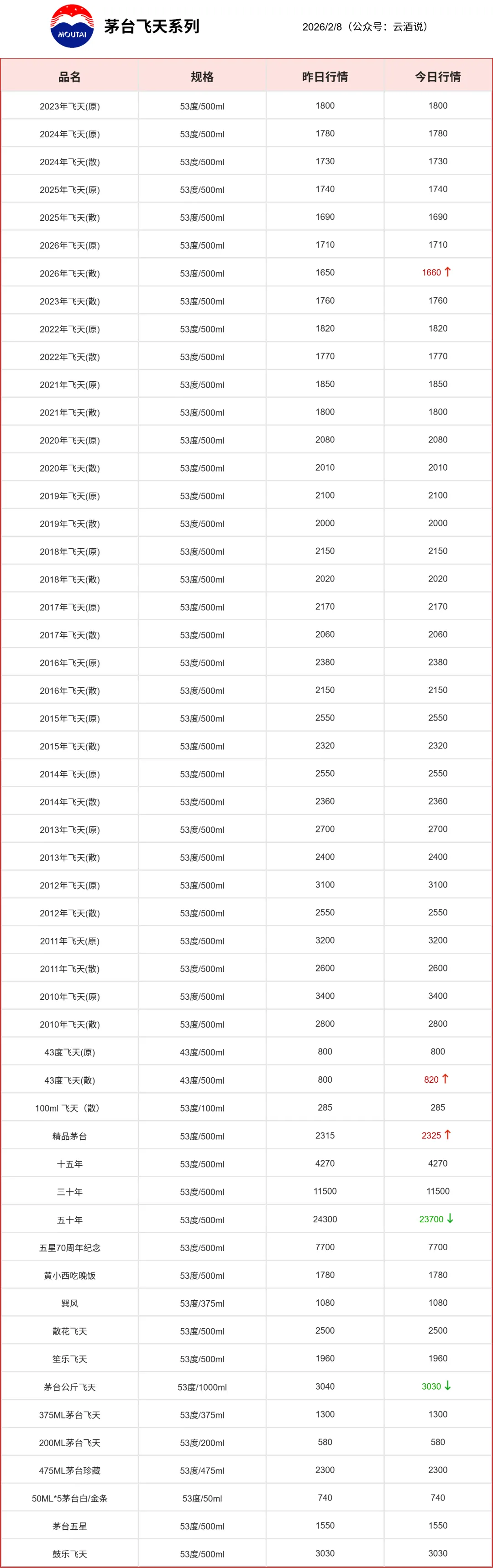 >2月8日,白酒茅台酒今日行情价格——43度茅台上涨