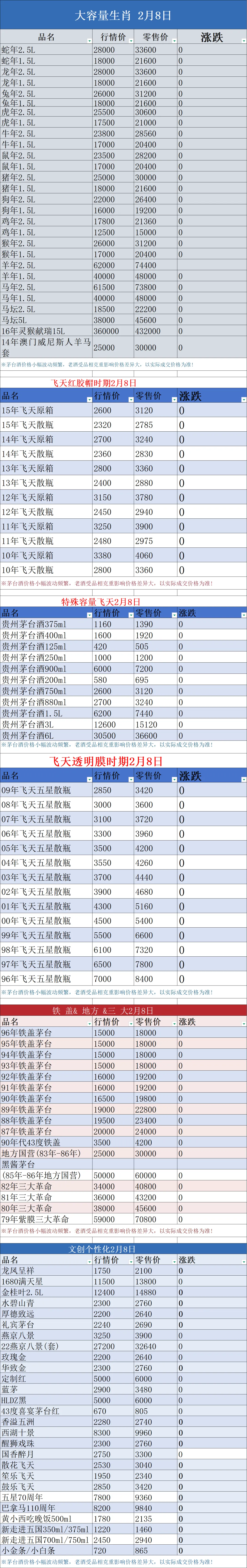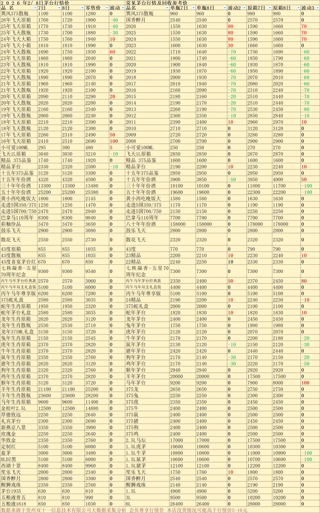今天是2026年2月8日星期日,与昨日行情相比:常规茅台中:2026年飞天原箱,2025年飞天原箱,2025年飞天大箱,2026年飞天散瓶,飞天1L,精品茅台下跌;2020年飞天原箱,2017年飞天原箱,2016年飞天原箱上涨,回收参考价常规茅台中:2026年飞天原箱,2025年飞天原箱,2025年飞天大箱,2026年飞天散瓶,飞天1L,精品茅台下跌;2020年飞天原箱,2017年飞天原箱,2016年飞天原箱上涨,2026年飞天原箱,2025年飞天原箱,2024年飞天原箱,2023年飞天原箱2011年原箱飞天,精品茅台,经典马茅,回收上涨,2026年散瓶飞天,2025年散瓶飞天,2024年散瓶飞天,2023年散瓶飞天,回收上涨,鼠茅原箱,原箱狗茅,原箱鸡茅原箱30年茅台,原箱50年茅台,散瓶15年茅台,2022年--2012年原箱和散瓶飞天回收跌价。