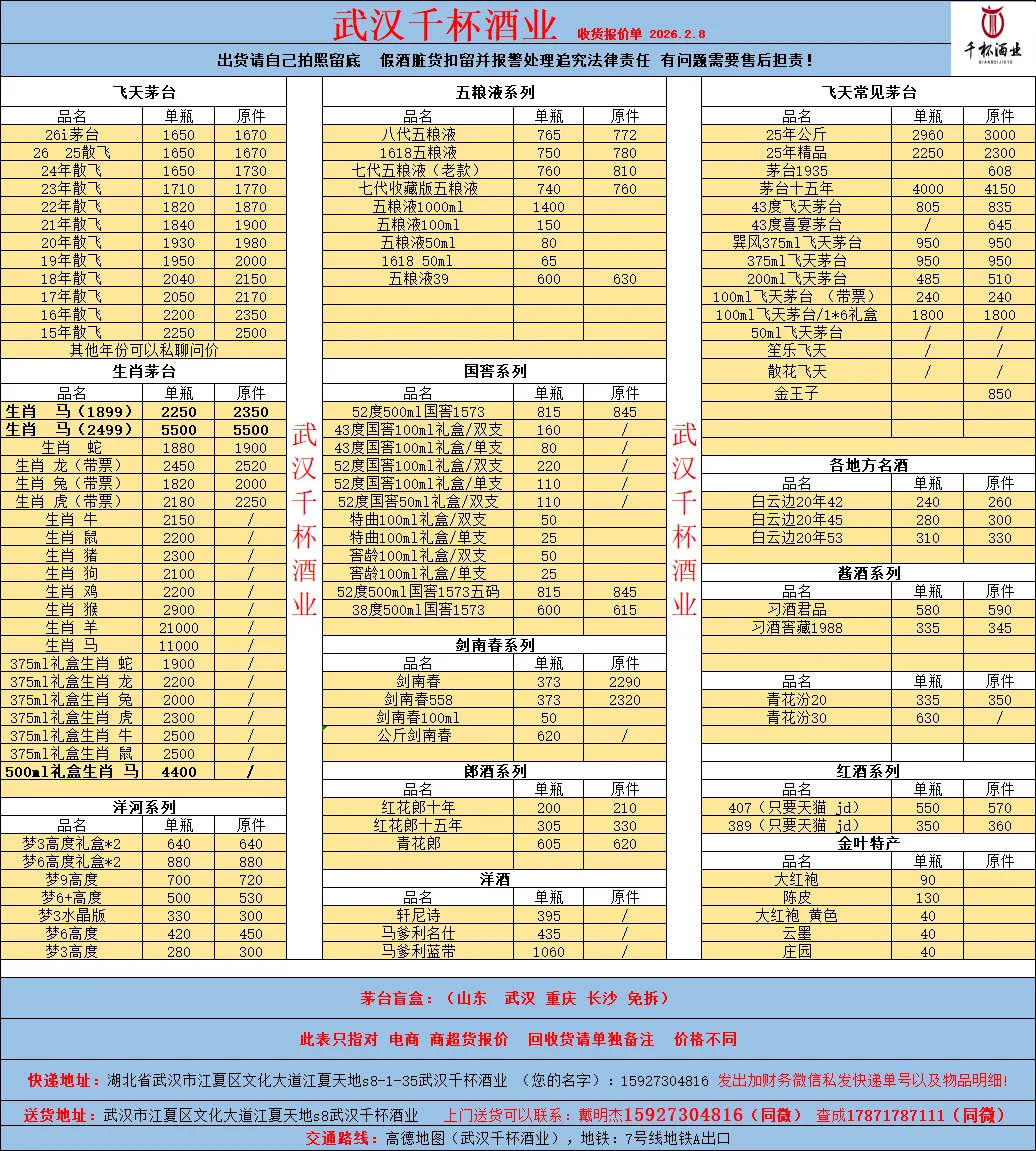 1、本行情价格为各品类酒的市场回收价格,查查收货线报以北京、上海、广州、深圳、贵阳、成都、武汉等7城市的主要酒行当天的报价来计算全国综合平均数据。实际成交价格每个城市会有差异。