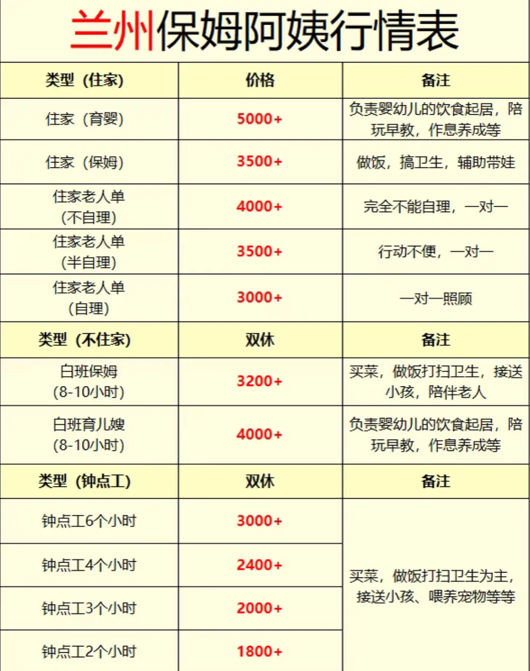 ☀️今天给大家整理了关于兰州各类型保姆的工作内容,以及价格参考,供大家做个参考!
