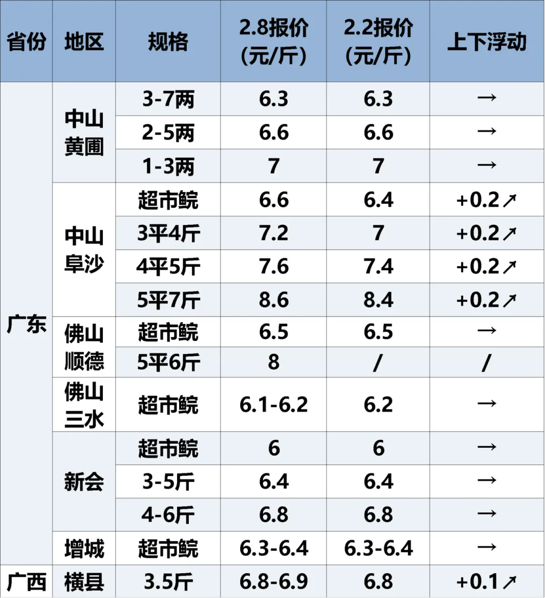 成鱼方面,中山、顺德市场涨幅明显,最高涨0.6元/斤。