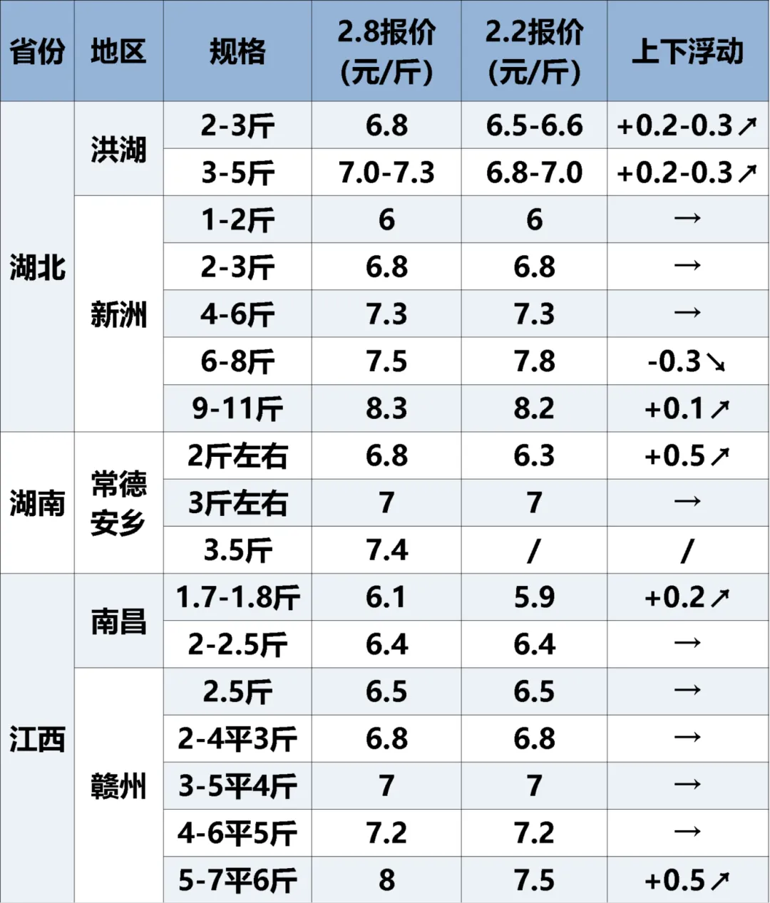 湖北:洪湖2-3斤6.8元/斤,3-5斤7.0-7.3元/斤,本周鱼价止跌回涨,上涨0.2-0.3元/斤;新洲1-2斤6元/斤,2-3斤6.8元/斤,4-6斤7.3元/斤,6-8斤7.5元/斤,9-11斤8.3元/斤,6-8斤规格下调0.3元/斤。