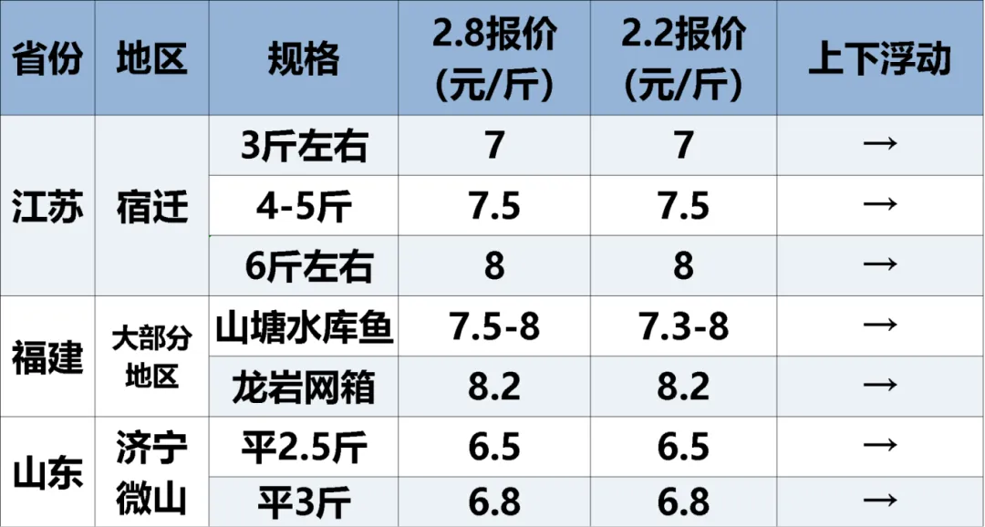 在山东地区,目前济宁平2.5斤6.5元,平3斤6.8元,本周鱼价波动不大。