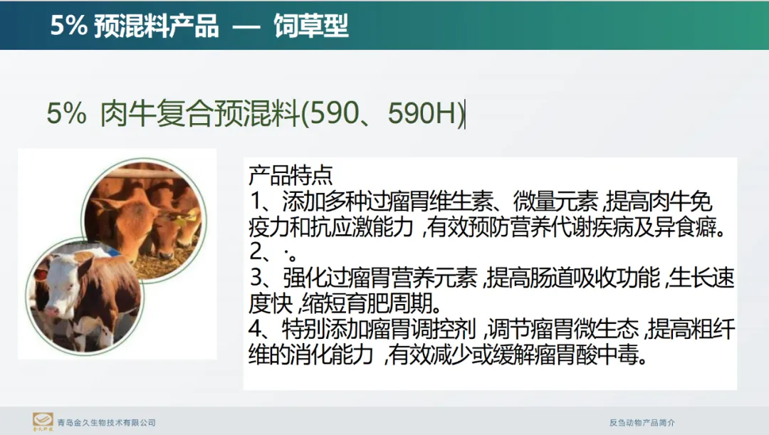 青岛金久生物技术有限公司:猪次粉型预混料首创厂家,自2000年至今25年!肉牛5090酒糟型系列产品,专业利用酒糟,行业领先,解决酸中毒问题,大大降低养殖成本!