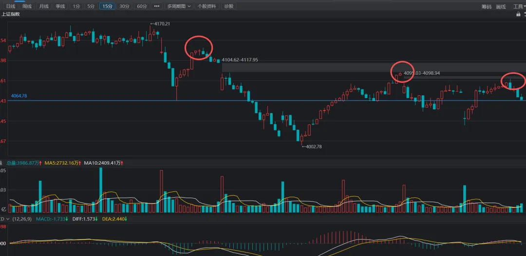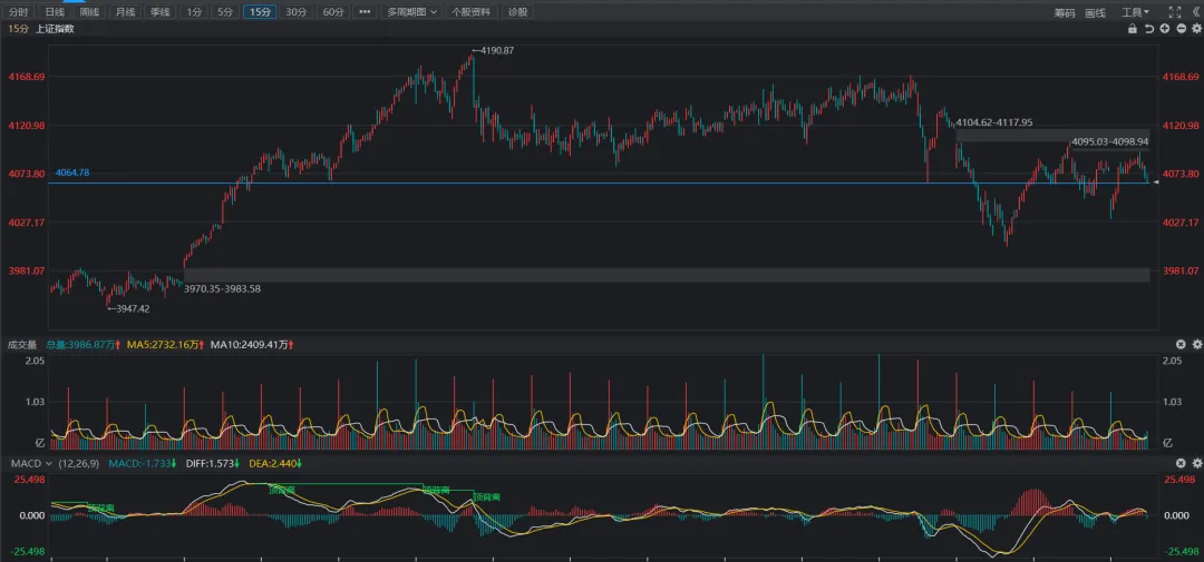 15分钟走势,短期跌破支撑线后再次回到上方,且macd仍在上方,下周一开盘后,若能持续维持在上方,那么反弹将继续。若下个交易日macd直接下水,那么反弹就将结束了,这个观察周期暂定为3个15分钟k线。