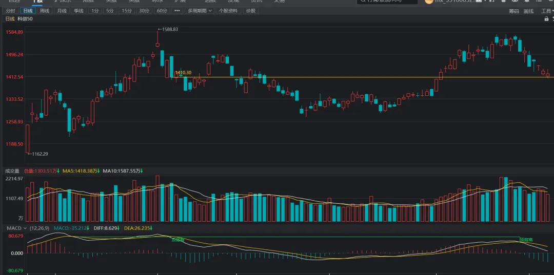 2、科创50回到前支撑线附近,为缩量的小幅度k线,表明在支撑位附近观望的较多,抛压较小。