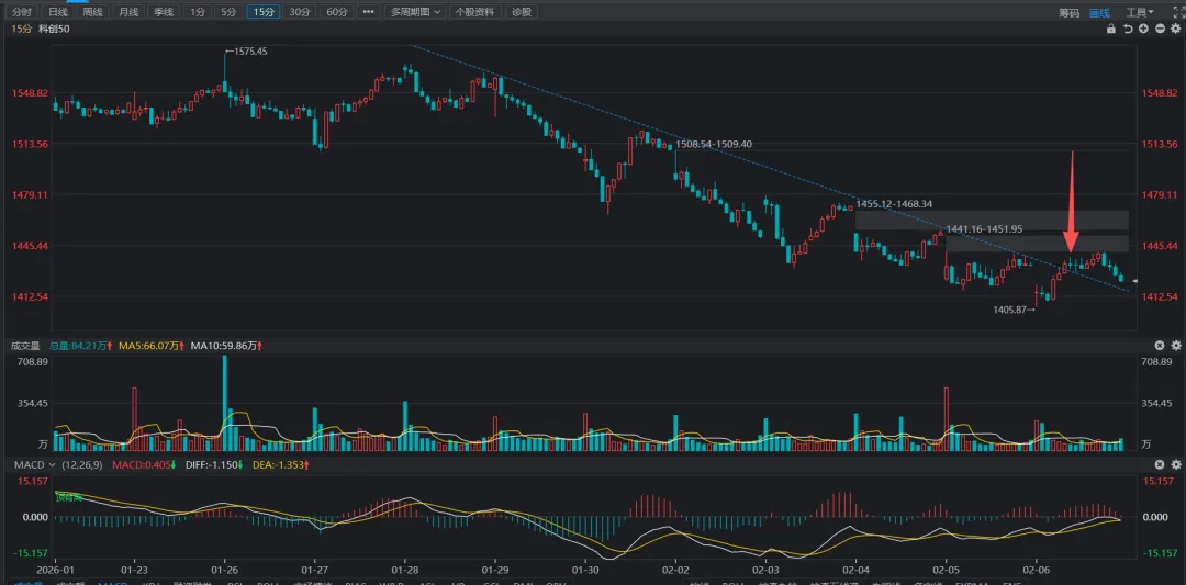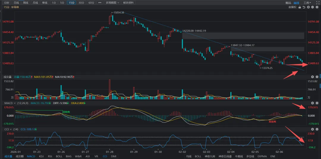 半导体板块的日线走势与科创50的走势非常相似,日线即将来到前方支撑位附近,15分钟级别的k线与科创50的走势更为相似,主要是因为科创50中的大部分标的都是半导体行业个股。