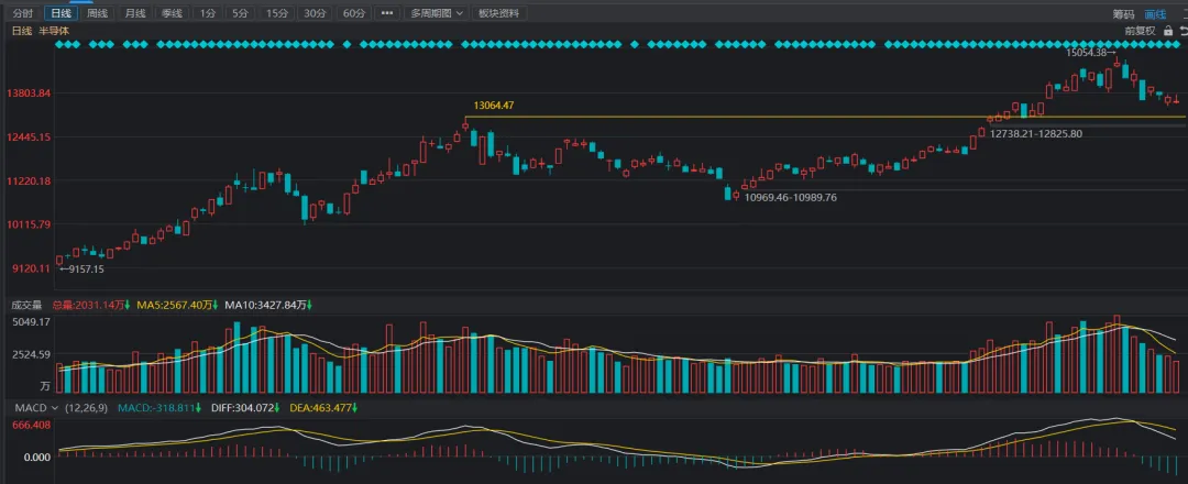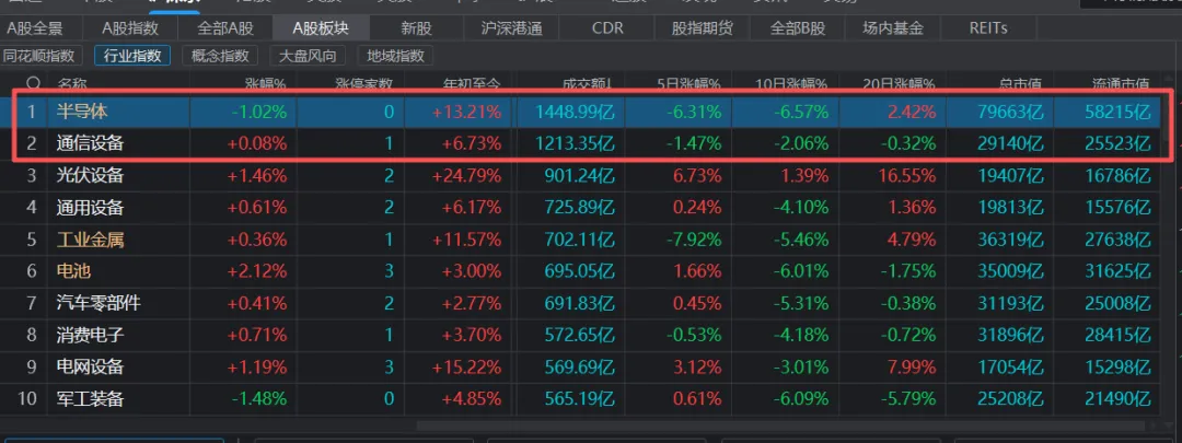 在同花顺软件中,半导体板块的成交金额,总市值,流通市值都是独一档的存在