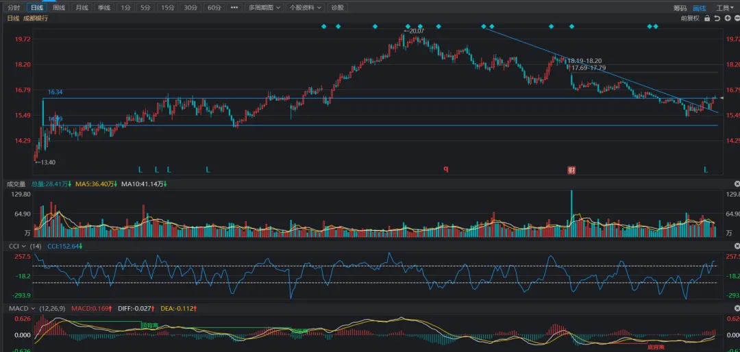 银行板块中,观察成都银行的走势,突破下降趋势线,在前方大阴线柱范围内进行震荡,且成交量相对开始活跃,同时macd呈现底背离形态,距离0轴线较近,在macd即将上水。但是由于60日均线下压,直接突破的概率不是很大,若能缩量回撤到20日线附近,再次放量反弹,且伴随macd完全上水,那么在指数走势不是很理想的情况下,银行可能会成为保险之后的护盘,资金扎堆的区域。