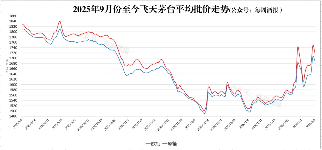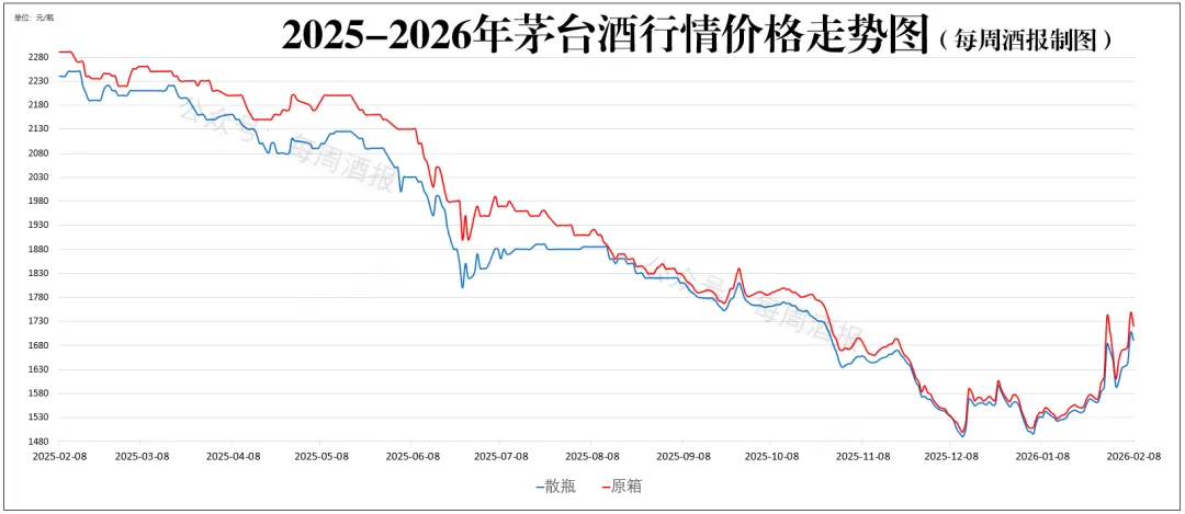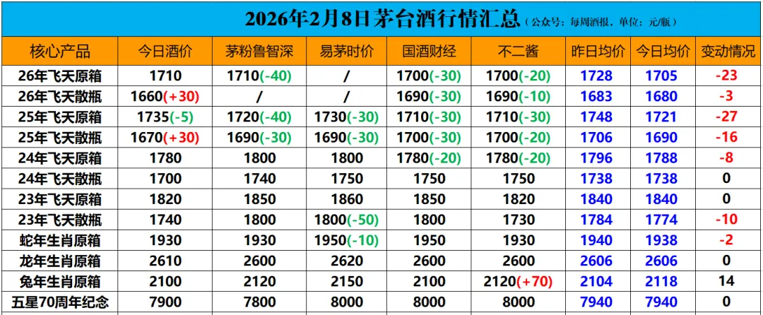 据每周酒报2月8日茅台行情价格监测数据: