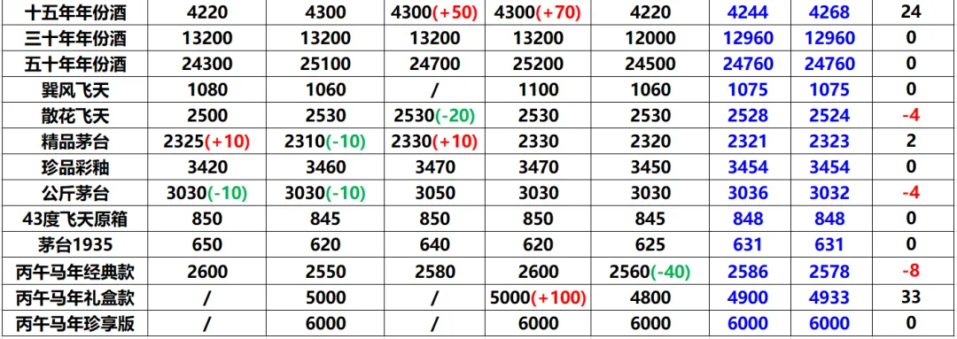 生肖茅台:丙午马年经典款行情均价下跌8元至2578元,礼盒款均价上涨33元至4933元,珍享版马茅均价保持不变,报收6000元。