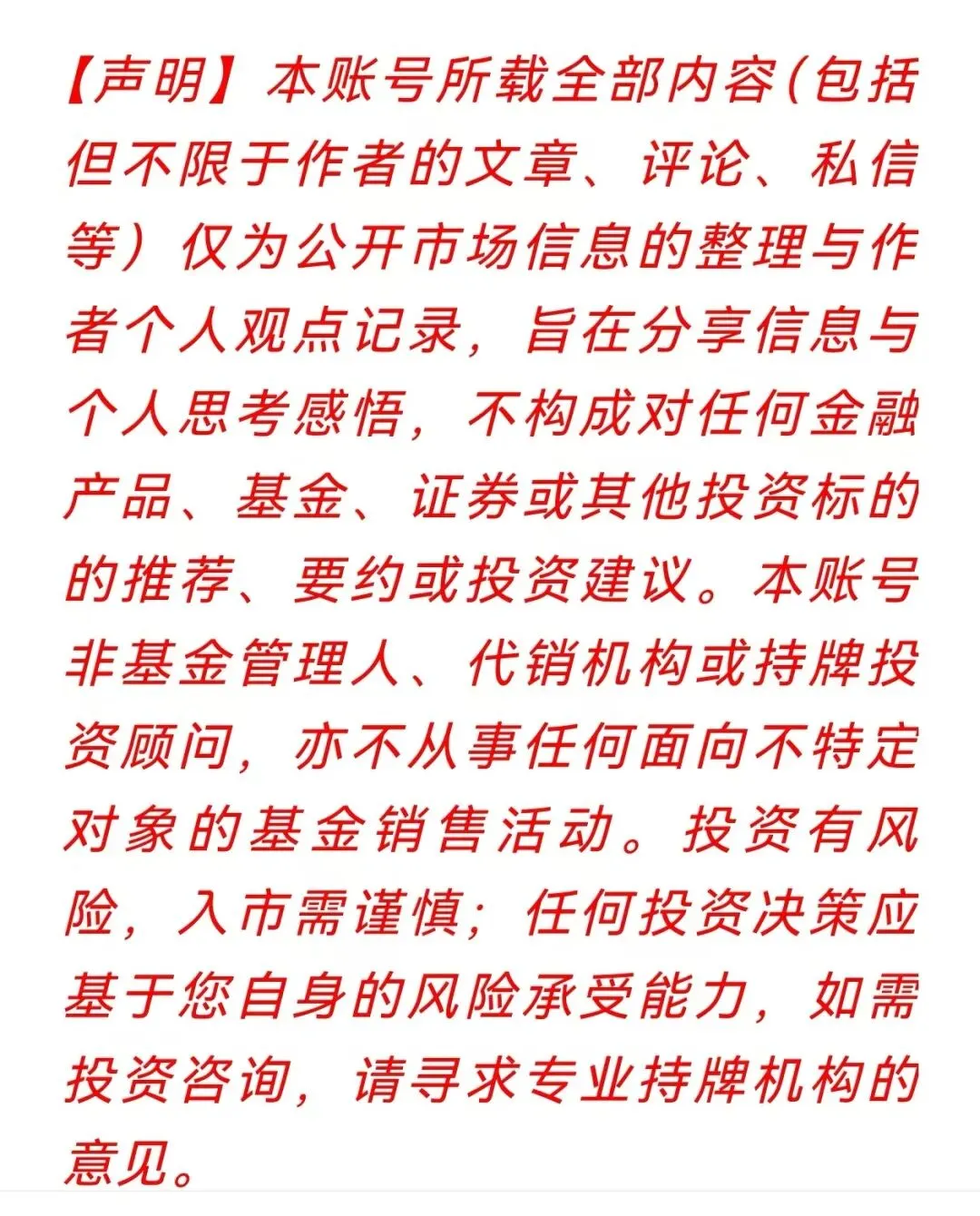 最后,不论是上涨或是下跌,我自己是避免把每日盈利或亏损在自己脑海里转换为相当于多久的劳动,以防心态“过度乐观”或“破大防”,防止扭曲自身操作,影响未来。指数不能直接投资,挂钩指数的基金是风险资产,贵金属也属于风险资产,投资有风险,历史收益不代表未来,决策需谨慎。