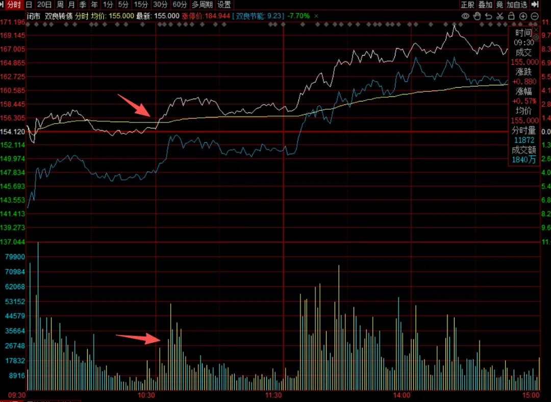 在日内超短交易中,分时均线就是生命线,它是日内成交的平均成本,是所有技术分析不可或缺的技术指标。一般在跌破分时线的时候,会有大量的止损盘涌出来。所以在日常的炒作中,有许多主控资金,在洗盘的时候,喜欢直接砸破分时均线,引导恐慌盘止损,等恐慌盘力竭之后,会再次拉起,由于分时均线是日内成本的聚集区,这时候,分时均线由支撑线变成了压力线,如果能有效突破分时均线,说明买盘强势,有重新开启上涨行情的可能。 我们可转债的日内操作,只选择活跃债进行,所以有量能前排的活跃债,分时线一直在均线下方横盘震荡,或缓慢开始上行,带量拉升,突破分时均线,追涨买入,跌破分时均线立马止损,分时走弱止盈。为更直观的展示,请看下图示例,仅供参考理解这项技术。