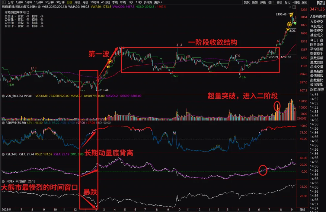 钨钼细分类别中的洛阳钼业、中钨高新、厦门钨业、章源钨业,彼时都和板块指数有同样的底部动量结构,而且第一波涨幅甚大,就是说新领导走马上任给出了明确信号,机构建仓加速了。