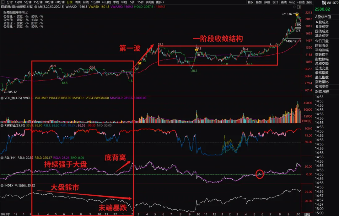去年5月份,有色行情还没有发动之前,我明确预期过它将是后续主线之一,其中最关键的判据就是2024年2月份的前置RSL底背离,彼时乌青同志刚刚走马上任,以及那一波上的巨大涨幅(前置动量),看图: