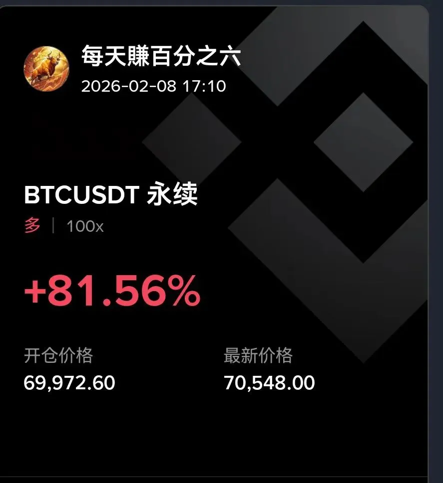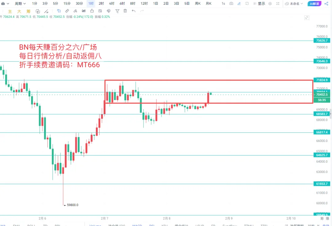 现在是02月08日下午17:05分,BTC刚刚突破压制了一天的70000价格关口,最高来到了70800的位置继续横盘震荡,在即将突破时70000市价进场的多单目前继续持有,计划在71388-73888-75888分批止盈,止损放在了69388。日线级别来看,自2月6日短暂跌破60000后BTC价格开始反弹,昨日最高反弹至71700后回落67200盘整,由于周末行情没有太多的成交量以及BTC乌龙指、ETH做市商BUG等事件造成行情数据暂时无法辨别,需要等待后市行情进一步明朗。个人认为目前的行情处在熊初的暴跌后的震荡盘整阶段,下一步还会二次探底甚至打出更低的低点,市场流动性会随着熊市的进一步深入而继续流失,目前最应当避免冲动型进场,高杠杆合约尽量少做,下一步可以根据仓位做一些现货交易,把手中的现货成本价格继续拉低,以保证下一次牛市到来时手中筹码的性价比和灵活性。如果BTC现货价格反弹至75588,我会根据到时市场的行情来判断是否减仓用来做T,ETH这里再次突破了2100的共识点位,持有低位现货的朋友需要注意上方2380的位置。
