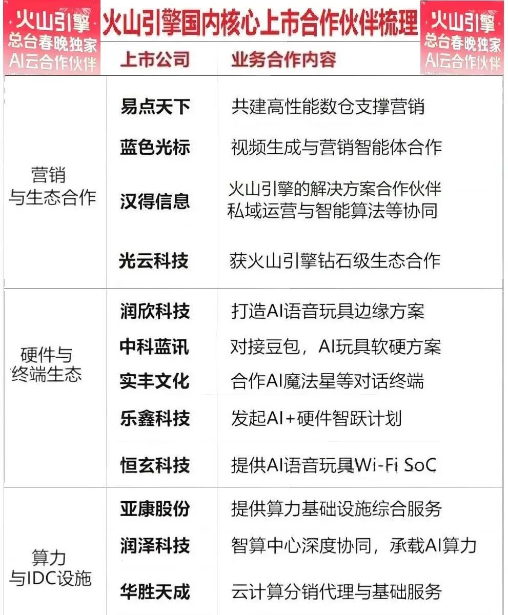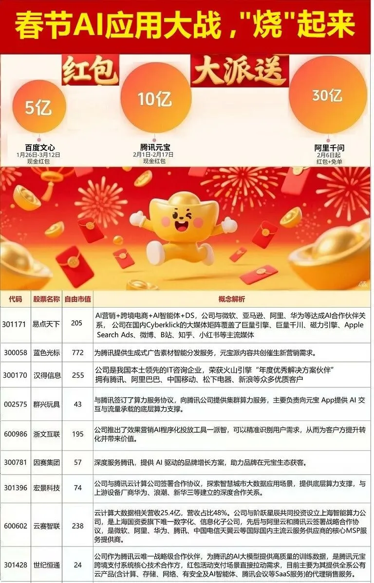 ②泛AI-大厂开启春节AI应用“流量大战”,腾讯元宝、阿里千问近期纷纷祭出重磅举措,豆包春晚发力在即;火山引擎总台春晚独家AI云合作伙伴;(易点天下、信科移动、东信和平、东土科技、蓝色光标、海量数据、完美世界等)