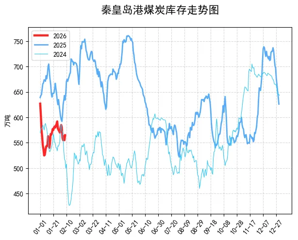 【港口情况】:港口库存一直在降,但动力煤价格没怎么大涨,而且实际成交挺淡的。我刚看了最新数据,截至昨天,秦港5500大卡的动力煤市场价是692元/吨,这周比上周微涨1块,贸易商虽然想挺价,但下游电厂拉货的积极性不高。主要是北方港口整体都在降库,之前寒潮封航结束后,中转是恢复了,但现在临近春节,工厂、电厂需求都在回落,就算库存降了,也没多少实际采购需求,估计短期煤价也就是窄幅晃一晃,涨不上去也跌不下来。