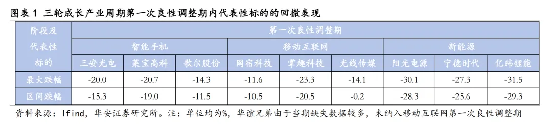 第一次良性调整期内,代表性个股的最大跌幅在15%-30%左右。我们在2025Q4季度策略中复盘过历次成长产业周期代表性标的的上涨时间和空间,在回撤复盘中,仍以相同的标的作为观察对象。最大跌幅来看,智能手机景气产业周期第一次良性调整期内,三只代表性标的最大回撤在15%-20%左右。移动互联网产业时期则在15%-25%左右。新能源产业时期则在30%左右。
