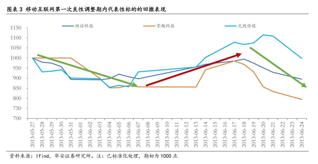 节奏上看,第一次良性调整期内,代表性标的均经历了“下跌→反弹→下跌”的过程。智能手机和移动互联网时期的调整节奏较相似,第一次下跌时间相对较长,第二次下跌短而促。而新能源时期则相反,第一次下跌时间较短且斜率大,第二次下跌时间则较长。