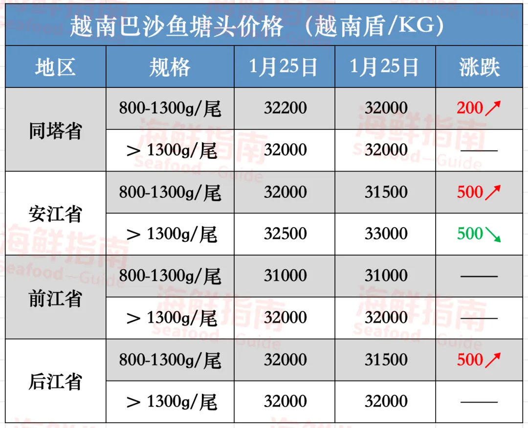 大于1300g/尾规格的大规格原料塘头报价统一为32000-32500越南盾/公斤,安江省产区价格跌500越南盾/公斤。