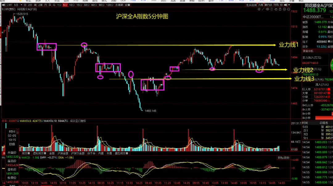 再说一下周一的走势应对,首先我们周五收盘后美股收出了中阳线,因此周一开盘可能出现高开的局面,看一下沪深全A指数5分钟的细节图: