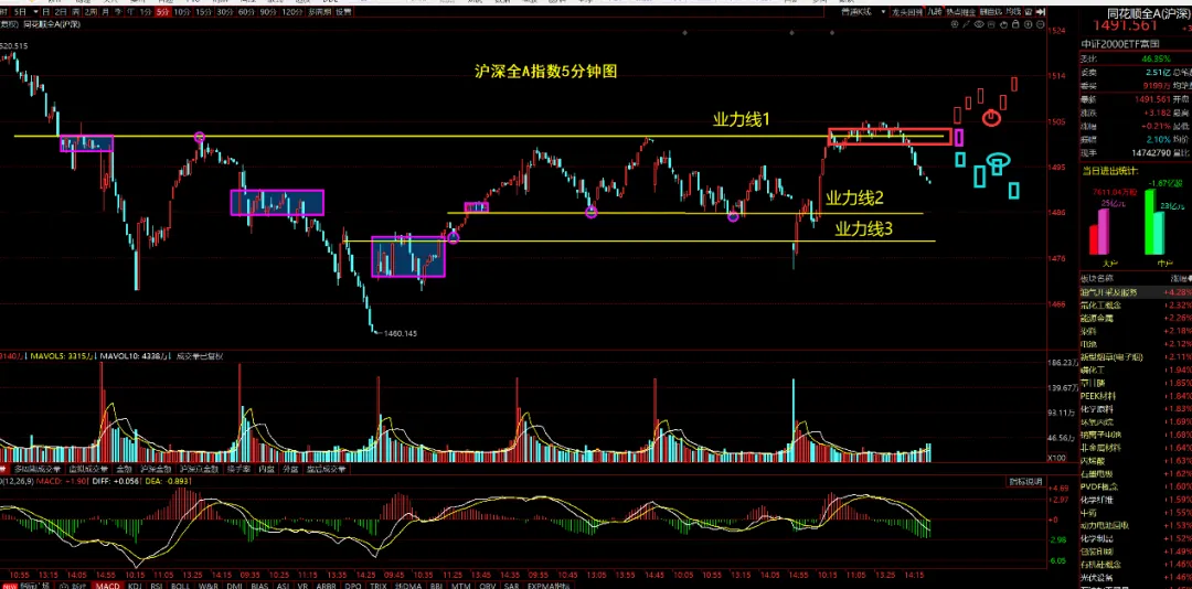 先看一下周四收盘文章的观点和周五行情表现的对比,周四收盘后的文章里我说“明天我个人的预期是先向下跌破业力线2,到业力线3处寻找支撑后再反弹。逻辑是现在的弱势是明面上的,但个股近期的下跌幅度也有一定的空间了,同时大趋势向上,所以近期大跌的概率也小”。下面是周四文章里的预测图: