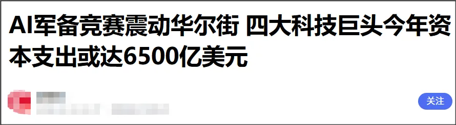美国四大科技巨头——亚马逊、谷歌、Meta、微软,2026年资本开支预计超过6500亿美元,相比2025年的4100亿美元,同比增长60%。