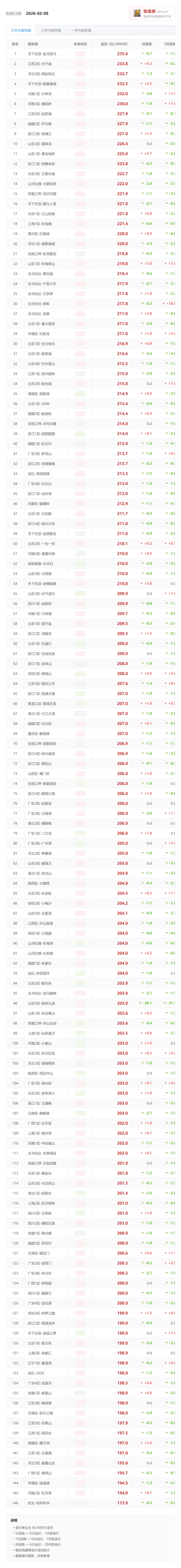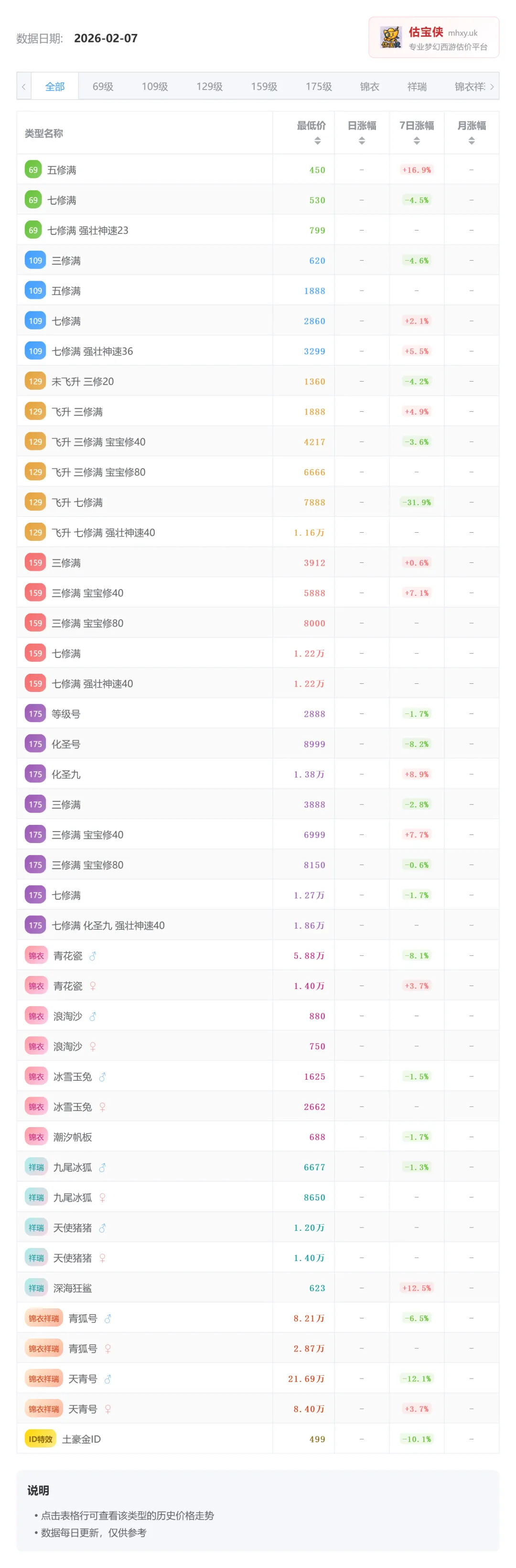 角色方面:69 段位整体稳定,五修满 7 日涨幅 +16.9%,七修满小幅回调,带强壮神速依旧有溢价。109 段位分化明显,普通三修走弱,七修满 + 强壮神速小幅上涨,属于稳健配置。129 段位波动最大,三修满与宝宝修仍有需求,但飞升七修满 7 日大跌 -31.9%,短期风险偏高。159 段位偏强,三修满 + 宝宝修 40 涨幅 +7.1%,高配价格坚挺。175 段位中,高端配置表现最好,化圣九上涨 +8.9%,普通号持续走弱。