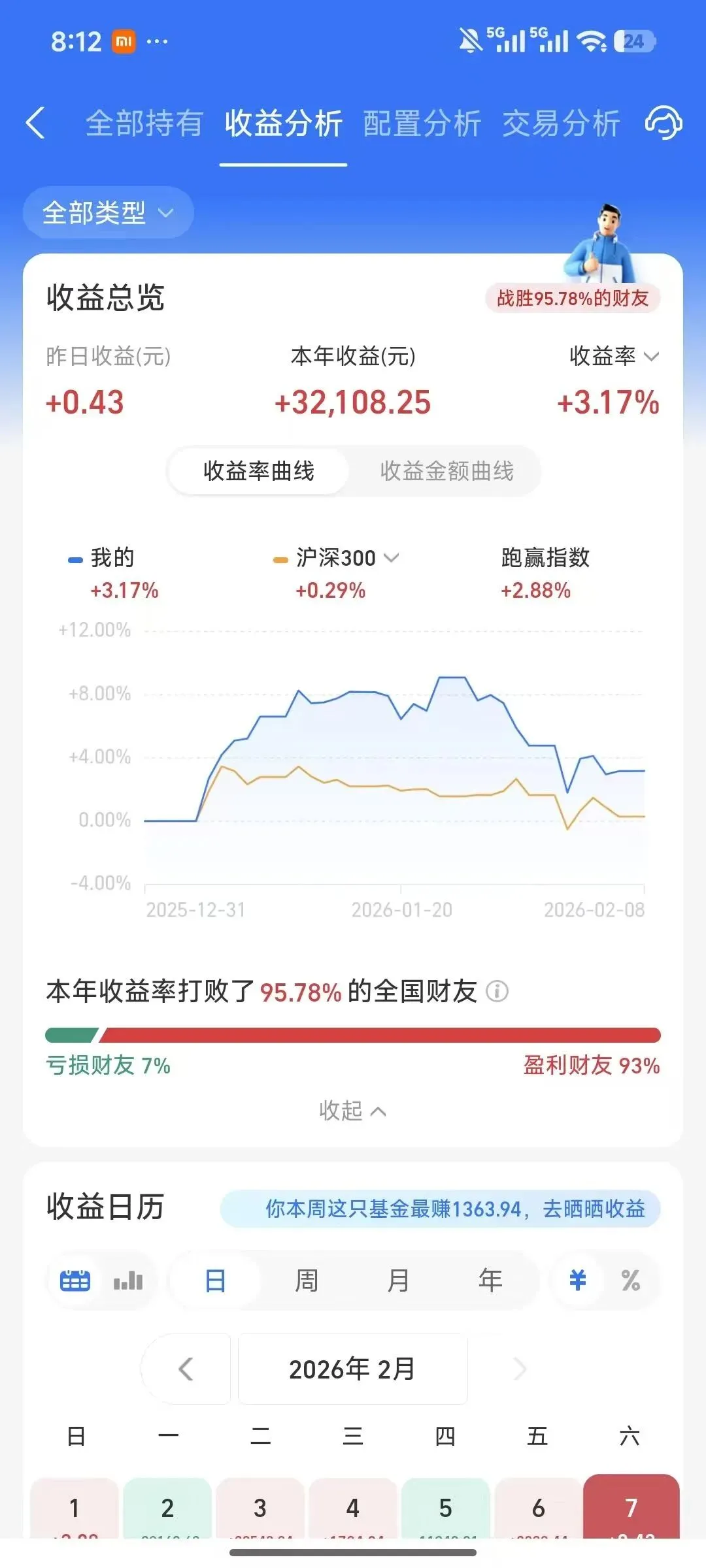 我记得1月份最高是9%的,跌了6%,太难了。不管我donot care ,坚持就好了。