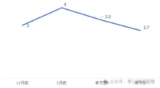 从一月以来,主产区平均价格从3.02元/斤上涨到4元/斤,主销区平均价格从3.24上涨到4.29元/斤,截止2月8日,最高价大约出现在1月29日附近。在12月10号文章《 鸡蛋春节专题-春节前后高低点》中,预测最高价在3.6元/斤,实际上涨到4元/斤,超过预期的价格,但是最高点出现时间符合预期。因为1月底价格超出预期,所以需要修正春节前和春节后的价格,春节前延续1月底以来的下跌趋势,降至3.3元/斤,节后最低降至2.7元/斤。2026年一月的在产蛋鸡存栏13.42亿只,淘汰鸡日龄从484涨到595,鸡苗销量从12月的3959万羽上涨到4322万羽。存栏虽然从9月以来一直降低,但是绝对量仍然巨大,1月的超预期蛋价上涨让部分养殖者认为存栏去化已经结束,开始减少淘汰并大量补栏。大部分屠宰企业在腊月20到腊月23日停止淘汰鸡屠宰,年后最早初八上班,半个多月的时间没有老母鸡淘汰,所以2月份的淘汰量比1月会少很多,而且蛋鸡开产会比1月稍多,淘汰少开产多导致2月的在产蛋鸡存栏仍然会大于13.4亿只。所有腊月不淘汰的养殖者都知道3月的价格低,但仍然不在腊月高价的时候淘汰,这是因为大家预期3月的低价不会持续很久,会很快过去,所以3月上旬即使价格低也不会淘汰很多鸡,如果低价持续时间短并且不低于现金流价格则3月不会发生超淘,3月底的存栏预计仍大于13.3亿只。但是这就存在一个矛盾,在需求正常时,高存栏和高蛋价不可同时存在,如何实现“低价持续时间短”且“13.3亿只”存栏呢?所以,大概率出现的情况应该是年后深跌到现金流成本附近(2.7元/斤),并且整个3月蛋价不超过3元/斤。免责声明:市场有风险,投资需谨慎,本文记录作者思考过程,仅供阅读者参考,所表述的意见并不构成对任何人的投资建议,不对任何人因使用本文中的内容所导致的损失负任何责任。