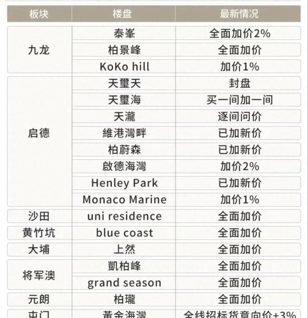 这段时间跑了几趟香港看盘,明显感觉气氛不一样了,九龙有个盘,开会前就先放风说要全面加2%,启德那边,有楼盘干脆直接封盘不卖,最近把一些数据又翻了一遍,发现现在不是一两家在搞噱头,而是二十多个盘一起调价,新界像元朗、屯门这些地方也在跟着往上抬,只是涨得没有那么狠