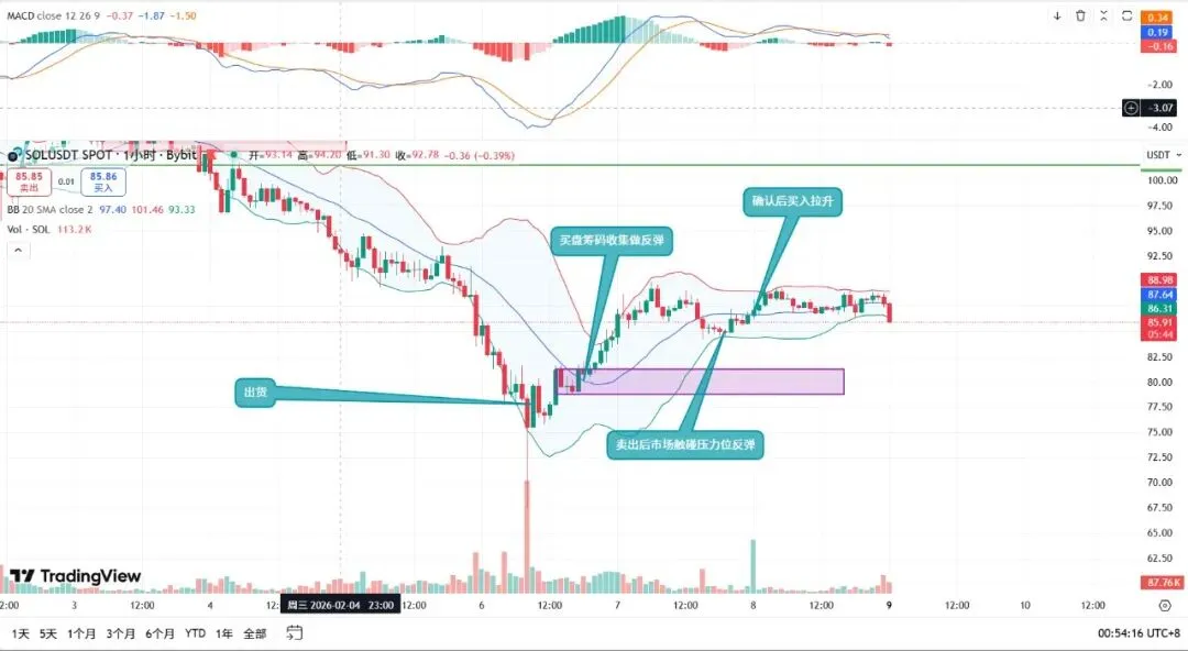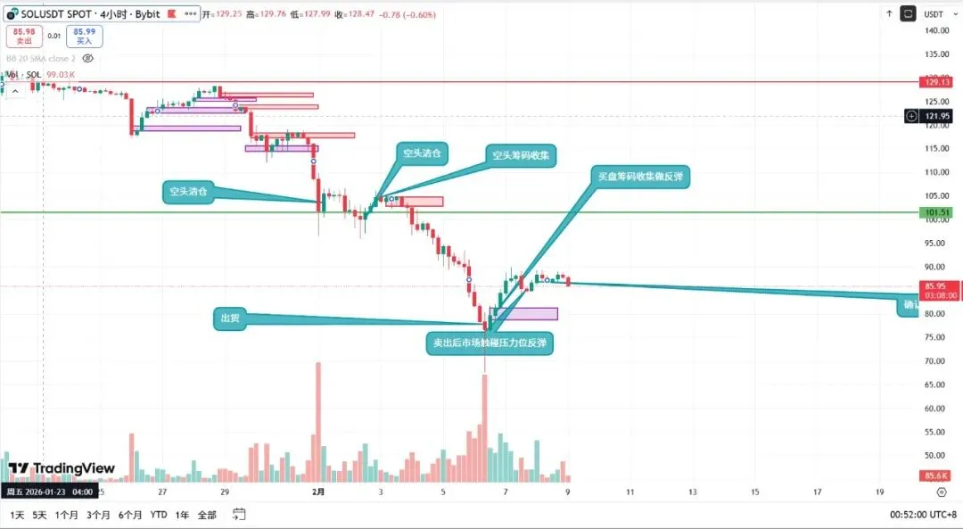 布林带收窄,交易量萎缩,下跌行情大概率很快会出现,价格大概率会看到紫色方框的区间上部分,对这一部分反弹进行获利了结。