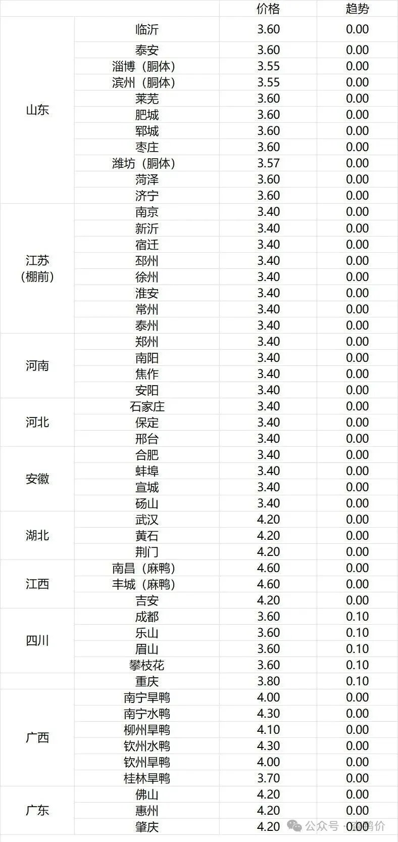微评:鸭苗报价局部下跌。(注:南方只报当天价格)临节交投情绪平淡,供需平衡。根据产品、养殖成本及鸭苗现状分析,预计近期鸭苗价格呈稳中微调趋势。种蛋报价稳定。温馨提示:该价格为主流厂家报价,实际销售价格以成交价格为准,价格仅供参考。