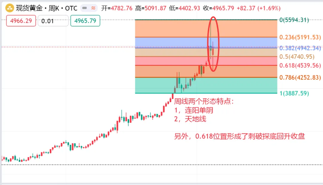 另外,0.618位置在上周来说,这也是多头中的最后倔强,恰恰形成了刺破反抽;