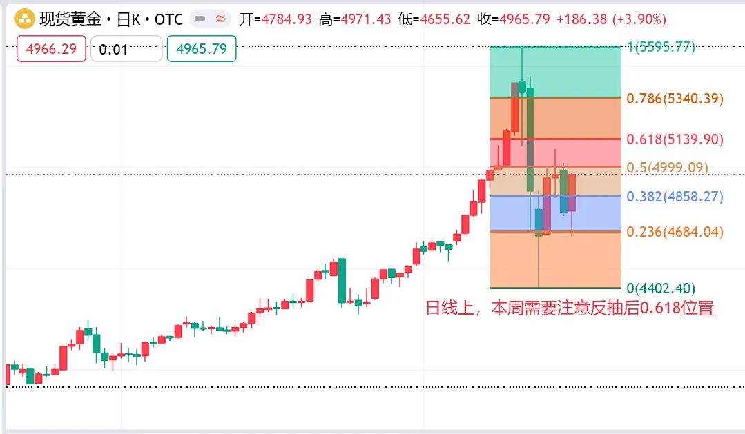 2,0.618位置同样值得注意,从前期高点5596下跌至4402低点,这波回撤的0.618位置在5140区域附近,